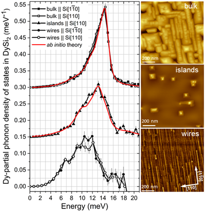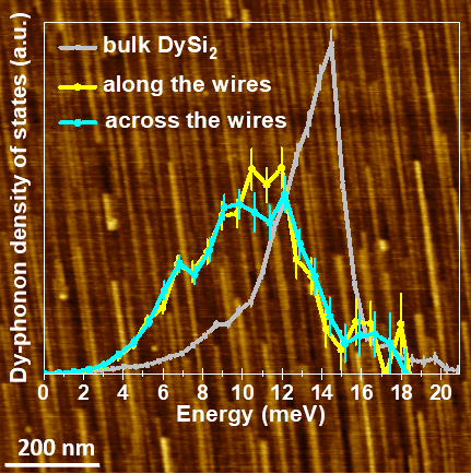 Using in situ nuclear inelastic scattering, an advanced synchrotron radiation technique, scientists of the KIT in collaboration with the ESRF-The European Synchrotron in Grenoble, the Polish Academy of Sciences in Krakow, and the Wigner Research Centre for Physics in Budapest managed to experimentally determine the Dy-partial phonon density of states of bulk DySi2 and self-organized nanoislands and nanowires on the Si(001) surface. The results reveal a softening of the crystal lattice of the nanoislands, which is further enhanced in the nanowires that significantly affects their thermodynamic and elastic properties. A comprehensive ab initio study unveils that the origin of these anomalies is the vibrations of the surface- and near-surface atoms as well as a very specific arrangement of Dy atoms on the Si(001) surface between the nanowires. Furthermore, the analysis demonstrate that, opposite to the widely accepted anisotropic lattice mismatch model, the nanowires grow with their length along the [0001] direction of the strained hexagonal unit cell.